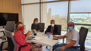 Alicante, 24/9/2020. El presidente de la Cámara de Comercio de Alicante, Juan Riera, se ha reunido hoy en Benidorm con el presidente de Hosbec, Toni Mayor, para apoyar al sector turístico ante la gravísima situación económica que sufre derivada de la pandemia, además de poner la institución al servicio de la asociación turística. En la reunión han estado acompañados por la presidenta de la Comisión de Turismo, Gema Amor y la secretaria general de HOSBEC, Nuria Montes.
