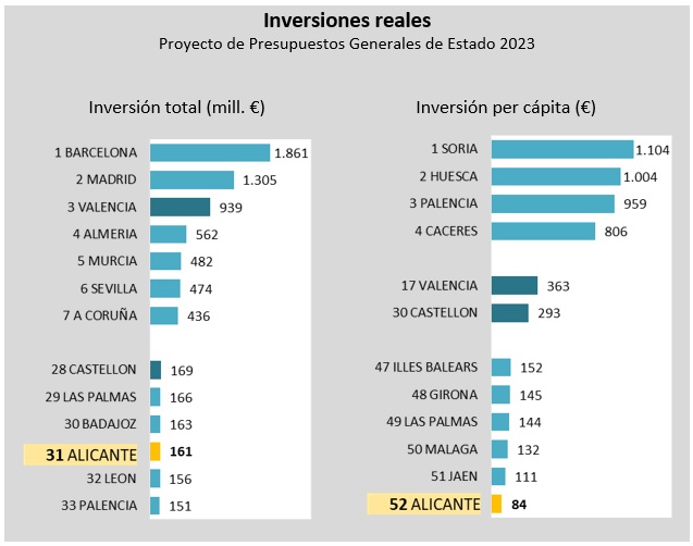El volumen de inversión asignado a la provincia en los PGE relega a Alicante al puesto número 31 del total nacional. En términos per cápita, la situación es mucho peor, ya que la provincia se sitúa a la cola del ranking nacional, con una inversión de 84,5 euros por habitante, la más baja de todas las provincias de España.