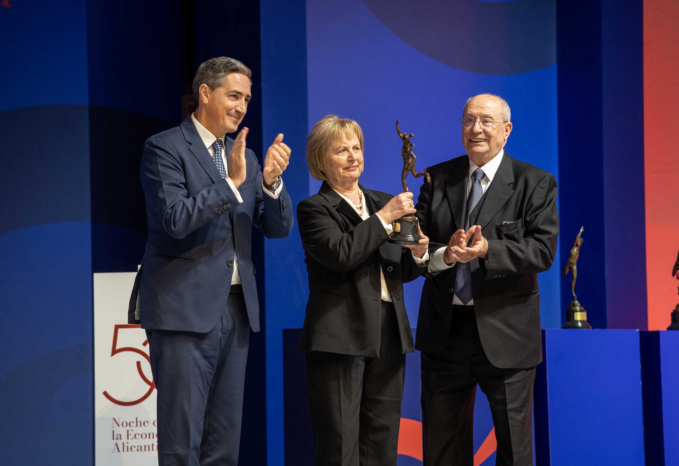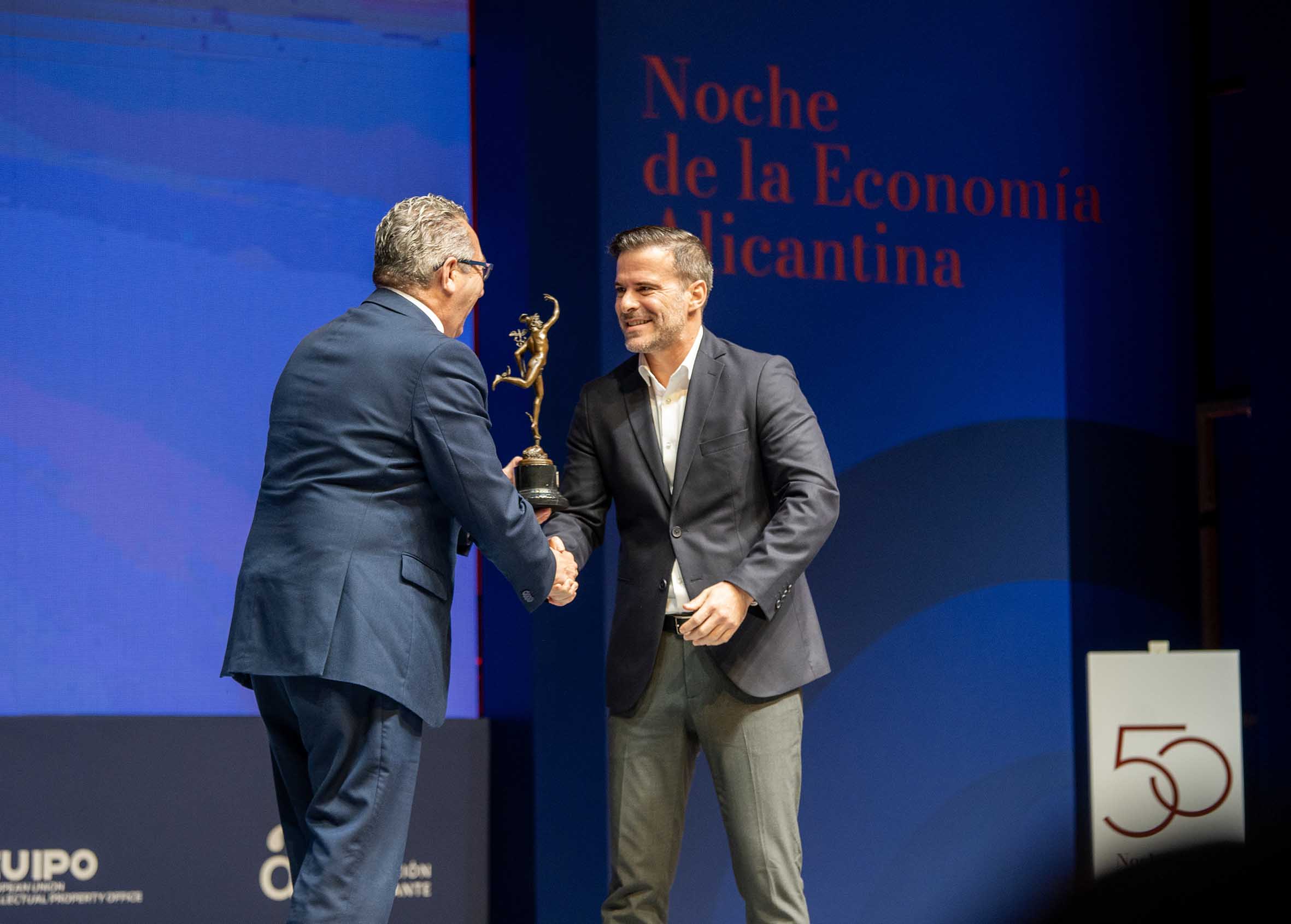 La Cámara de Comercio de Alicante ha celebrado hoy, jueves 20 de noviembre, la 50 edición de la Noche de la Economía Alicantina en el Auditorio de la Diputación de Alicante (ADDA), un encuentro patrocinado por el Banco Sabadell y la colaboración de la EUIPO y la Diputación de Alicante. La gala ha reunido más de 1.300 asistentes -entre empresarios, autoridades y representantes de diversos sectores económicos y sociales de la provincia de Alicante- y marca un hito, medio siglo reconociendo el talento, el esfuerzo y la capacidad de las empresas que han construido el progreso de la provincia de Alicante.
