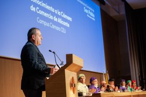 Marín ha destacado que el galardón a la Cámara de Comercio de Alicante se basa “en su destacada contribución a la sociedad mediante la conexión entre el ámbito empresarial y el formativo a través de Campus Cámara CEU, impulsando la empleabilidad y la cualificación de los alicantinos. En su discurso, Carlos Baño, presidente de la Cámara de Comercio de Alicante, ha destacado que “para nosotros es un verdadero honor recibir este reconocimiento por la colaboración constante y leal que mantenemos desde hace años y que pone de manifiesto que la colaboración entre la empresa y la universidad siempre es sinónimo de progreso”. Una colaboración que se ha concretado de manera especialmente significativa en el Campus Cámara CEU, “un proyecto construido desde la confluencia de esfuerzos y la confianza mutua, con el objetivo compartido de impulsar la formación empresarial, mejorar la empleabilidad y fomentar una inteligencia directiva basada en la honradez, la decencia y el compromiso con la sociedad”.