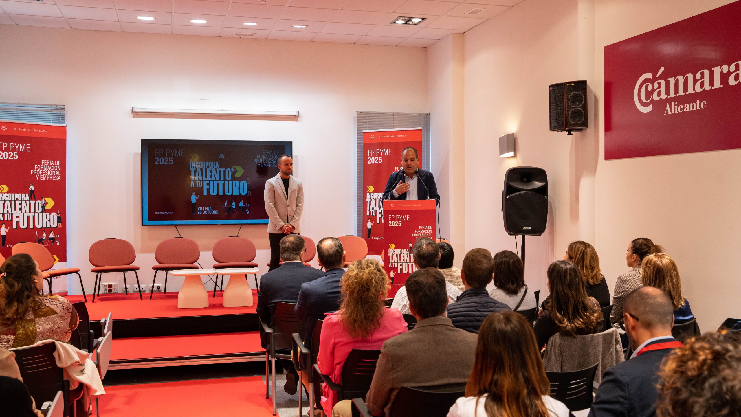 Más de 40 empresas se han dado cita hoy en la IV Feria FP Dual PYMEs 2025, organizada por la Cámara de Comercio de Alicante y el Ayuntamiento de Villena para promocionar la FP Dual entre el empresariado de la comarca del Alto Vinalopó. Este encuentro, celebrado en el Vivero de Empresas de Cámara en Villena, ofrece información práctica para las empresas que buscan jóvenes con formación para su introducción en la dinámica de prácticas reales para completar su formación y captar talento que nutra las plantillas de las empresas del Alto Vinalopó. La feria ha sido inaugurada por el presidente de la Cámara de Comercio de Alicante, Carlos Baño, y el alcalde de Villena, Fulgencio Cerdán.